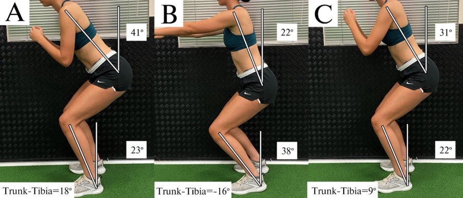 B: Greater tibial inclination shown-will ask the quads to work more than the hip extensors.